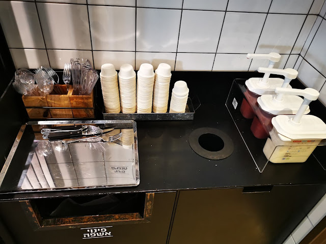 גם כאן, ישנם קטשופ ומיונז שאפשר לקחת מדיספנסרים.